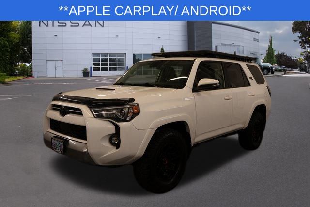 We Buy cars- Fast, Fair and Easy This 2022 White Toyota 4Runner TRD Off-Road Premium 4WD is well equipped and includes these features and benefits: 4WD, Black/Graphite Artificial Leather, Apple CarPlay/Android Auto, Auto High-beam Headlights, Exterior Parking Camera Rear, 3.727 Axle Ratio, 4-Wheel Disc Brakes, 8 Speakers, ABS brakes, Air Conditioning, Alloy wheels, AM/FM radio: SiriusXM, Anti-whiplash front head restraints, Auto-dimming Rear-View mirror, Black Roof Rails, Blind Spot Monitor (BSM), Brake assist, Bumpers: body-color, Compass, Driver door bin, Driver vanity mirror, Dual front impact airbags, Dual front side impact airbags, Electronic Stability Control, Emergency communication system: Safety Connect with 1-year trial, Front anti-roll bar, Front Bucket Seats, Front Center Armrest, Front fog lights, Front reading lights, Front wheel independent suspension, Garage Door Opener, Garage door transmitter: HomeLink, Heated door mirrors, Heated Front Bucket Seats, Heated front seats, Illuminated entry, Knee airbag, Leather Shift Knob, Low tire pressure warning, Occupant sensing airbag, Outside Rear View Mirror, Outside temperature display, Overhead airbag, Overhead console, Panic alarm, Passenger door bin, Passenger vanity mirror, Power door mirrors, Power driver seat, Power passenger seat, Power steering, Power windows, Radio: Premium Audio w/Dynamic Navigation, Rear anti-roll bar, Rear seat center armrest, Rear window defroster, Rear window wiper, Remote keyless entry, Roof rack: rails only, Security system, SofTex Seat Trim, Speed control, Speed-sensing steering, Split folding rear seat, Spoiler, Steering wheel mounted audio controls, Tachometer, Telescoping steering wheel, Tilt steering wheel, Traction control, Trip computer, Turn signal indicator mirrors, Variably intermittent wipers, and Wheels: 17" Unique 7-Spoke Off-Road Alloy. **BLINDSPOT MONITOR**, **LANE KEEPING ASSIST**, **BACKUP CAMERA**, **APPLE CARPLAY/ ANDROID**, **BLUETOOTH**, 4WD, Black/Graphite Artificial Leather, Apple CarPlay/Android Auto, Auto High-beam Headlights, Exterior Parking Camera Rear.